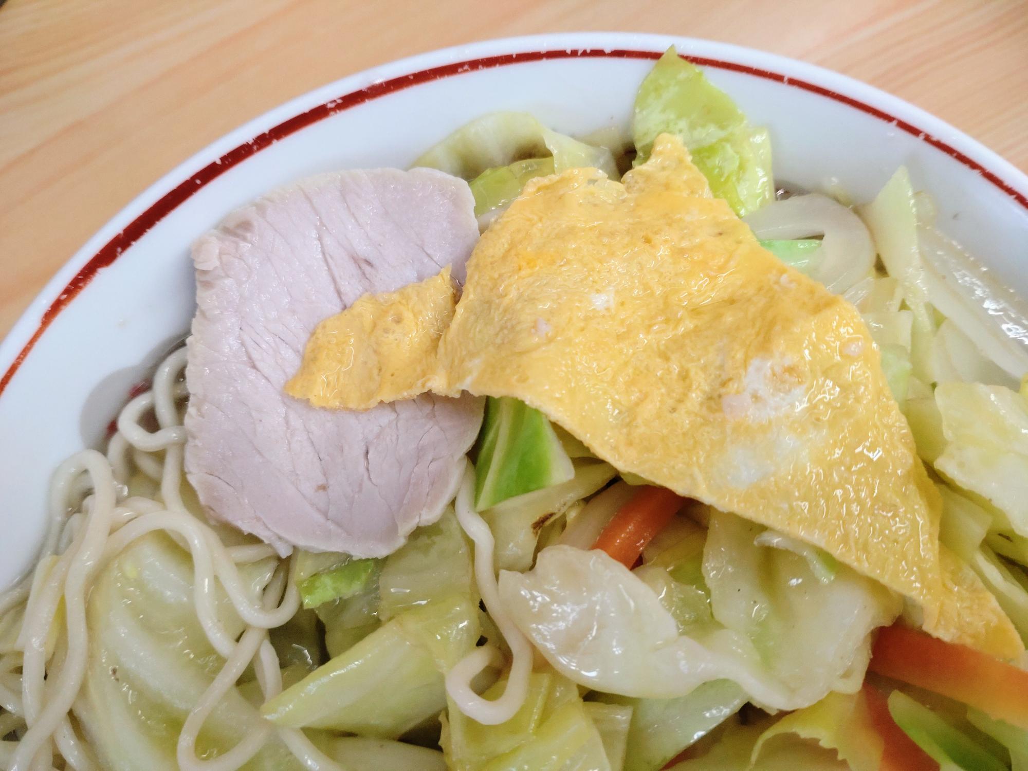 山盛りすぎて見えない薄焼き卵1枚と、数枚のチャーシューが中央部分にたっぷり入っています。