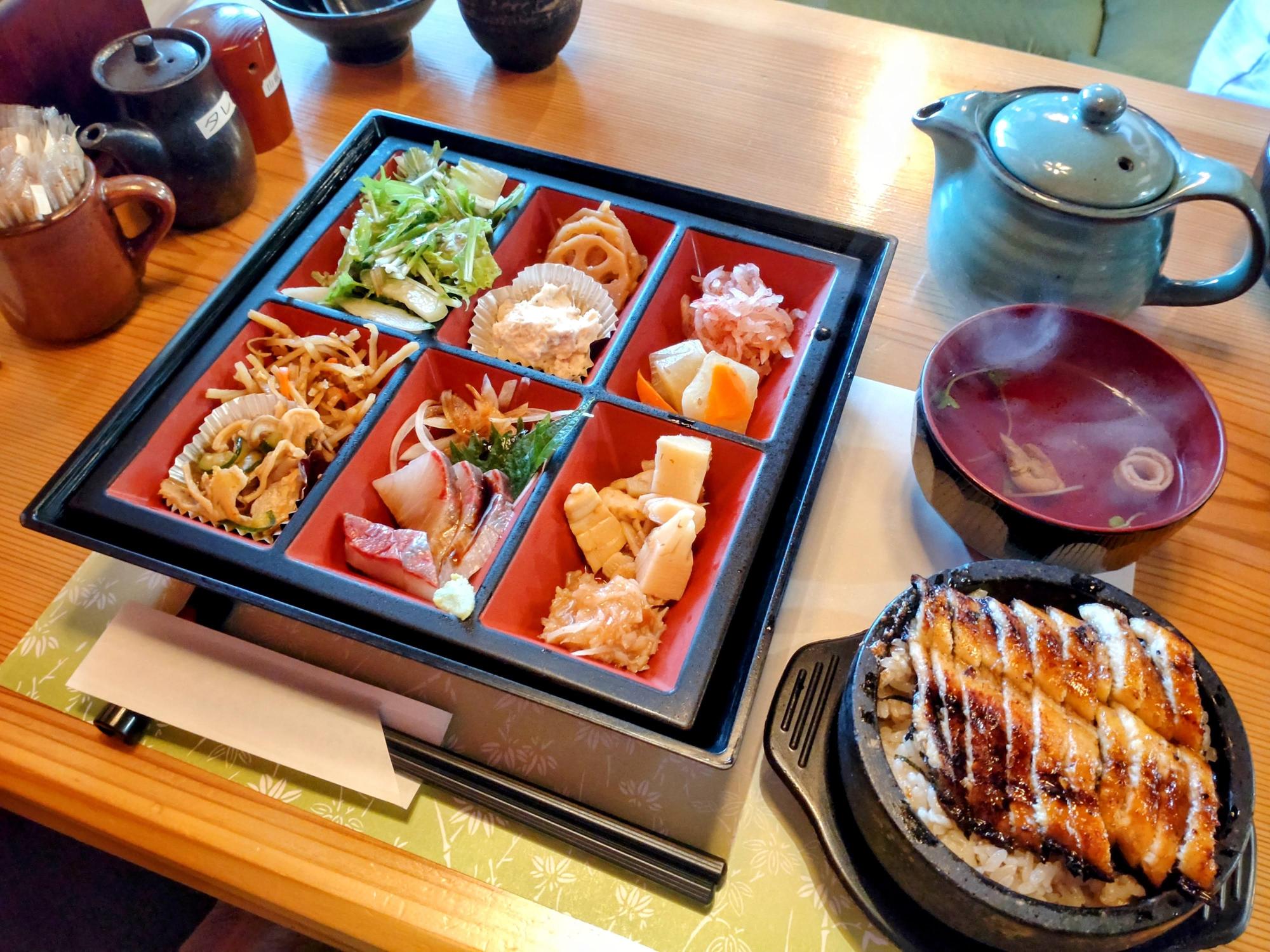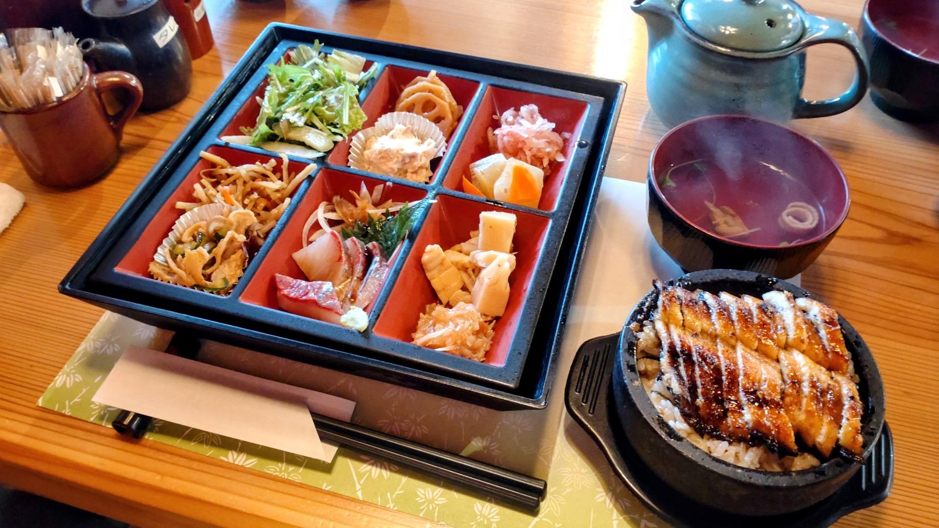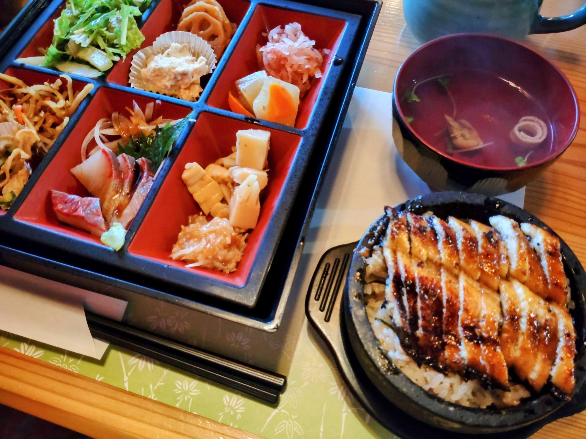 お店の名物、石窯に入った熱々のひつまぶしと肝吸い、ボリューム満点のお惣菜とデザートがリーズナブルにいただける平日10食限定のランチ「よしゐ会席」をいただきました。
