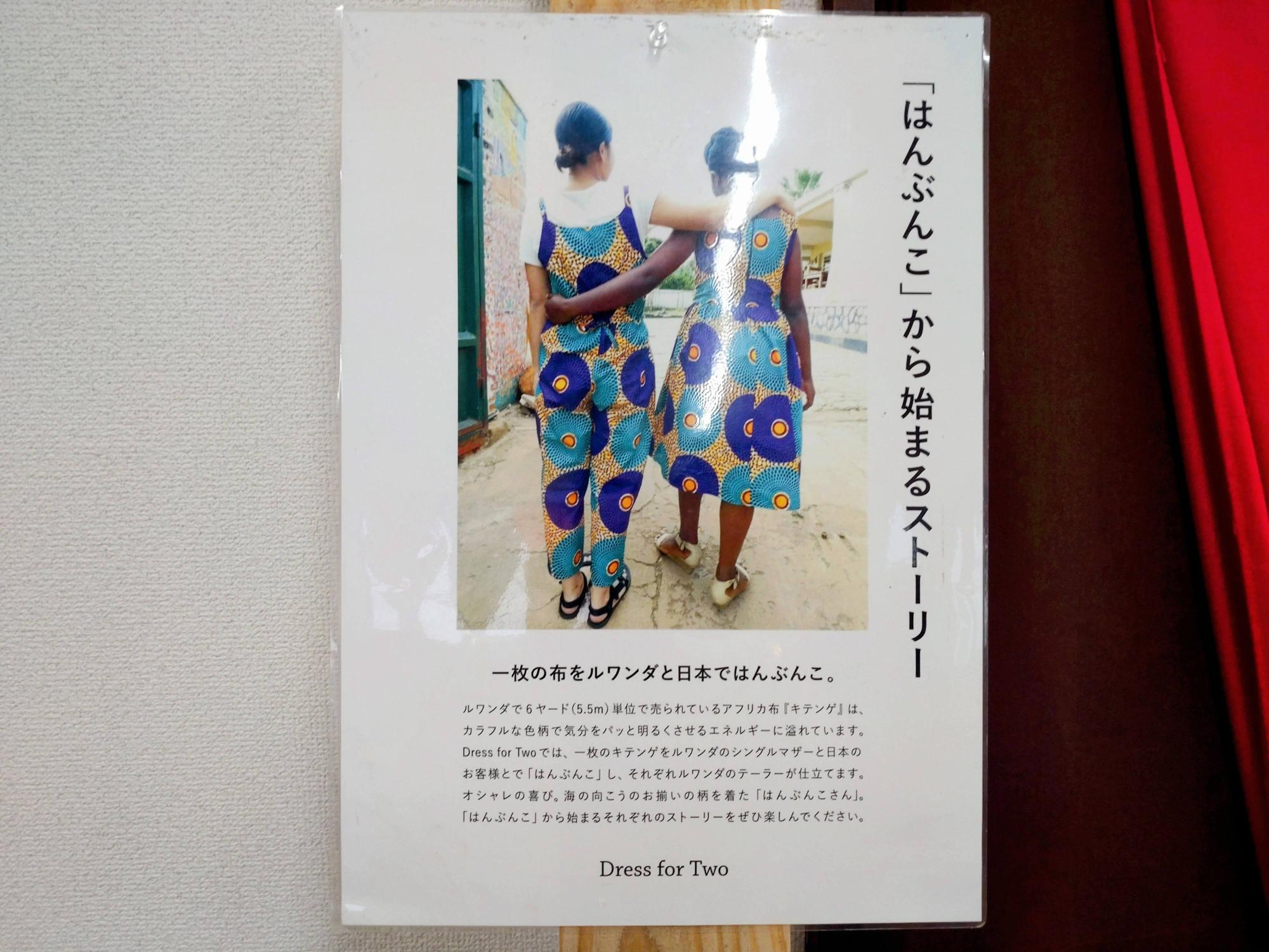 アフリカで親しまれているキテンゲという布生地をルワンダと日本で「はんぶんこ」にし、ルワンダの仕立屋さんが作ったお揃いの柄の服をシェアして楽しむ「Dress for Two」の活動も支援されています。
