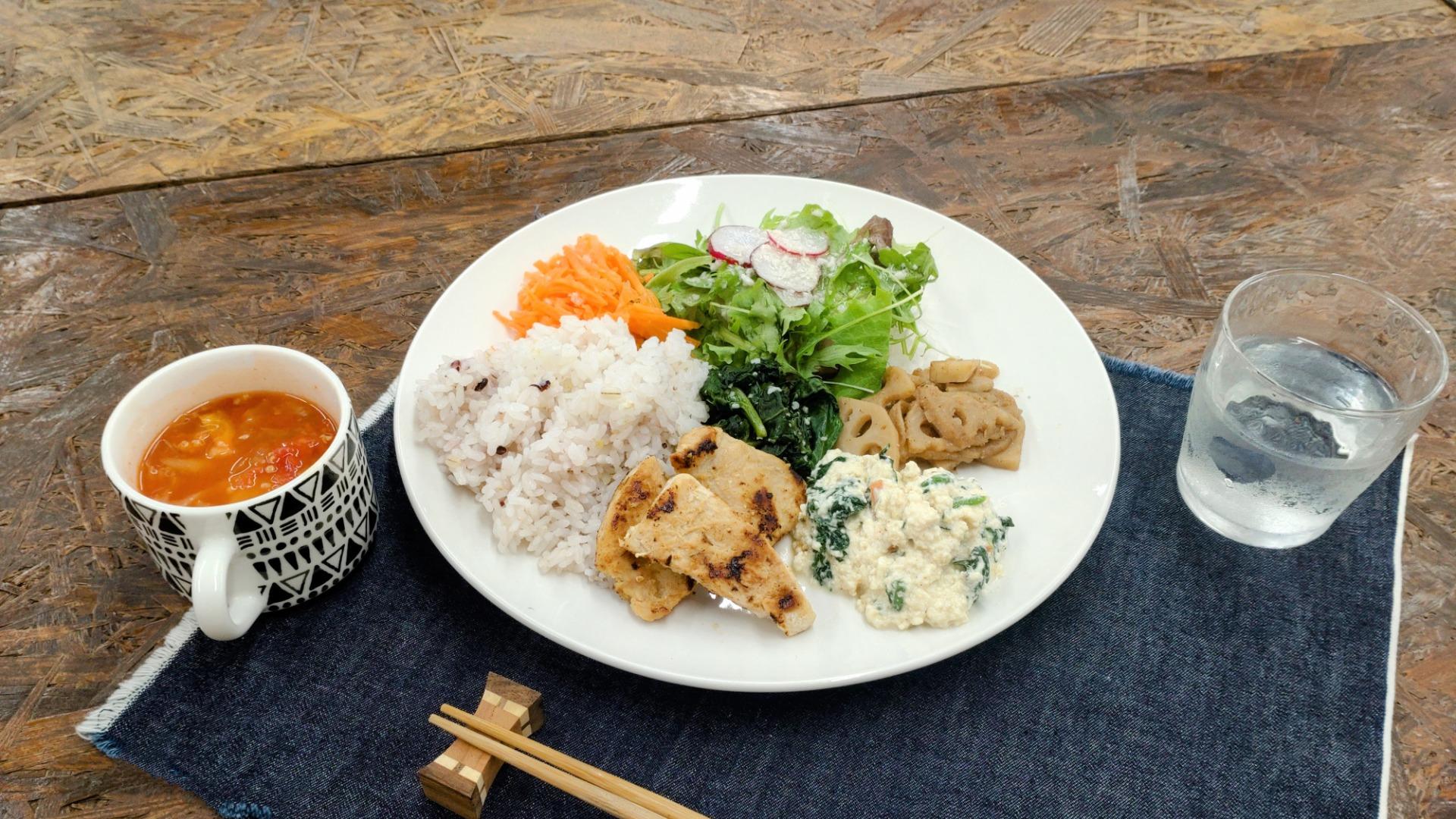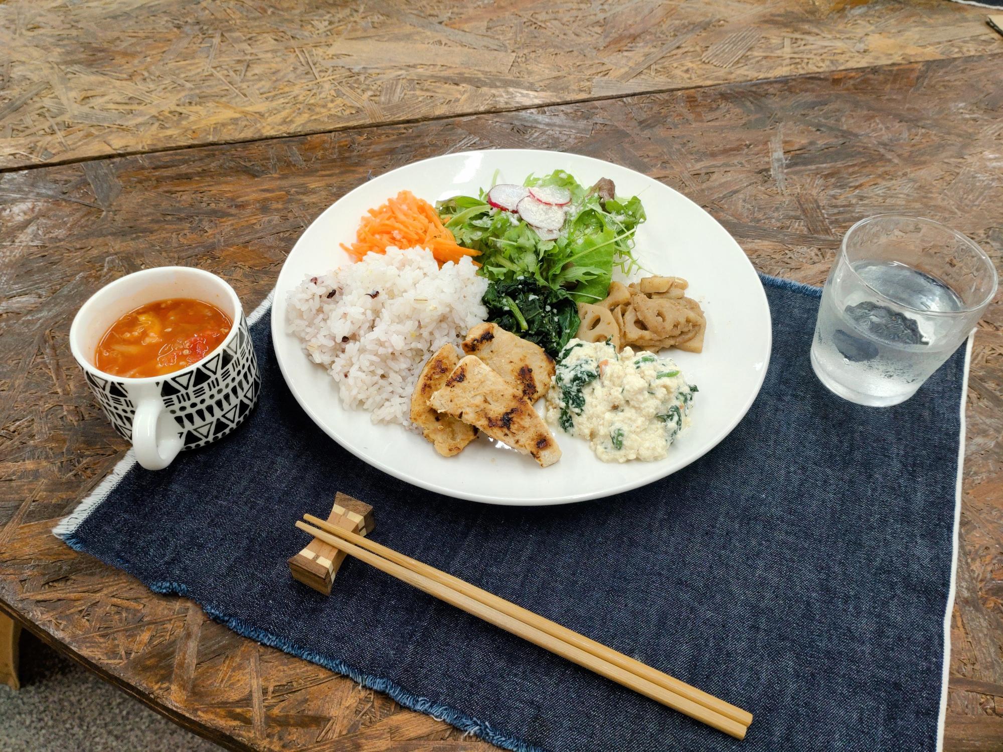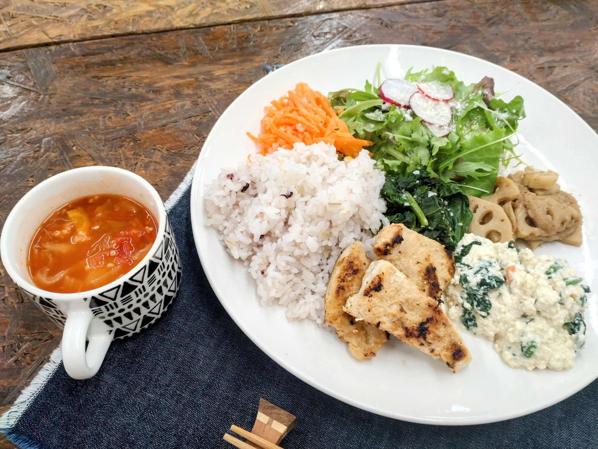 新鮮なお野菜、ヘルシーな雑穀米、お惣菜もすべてシンプルでおししい!
