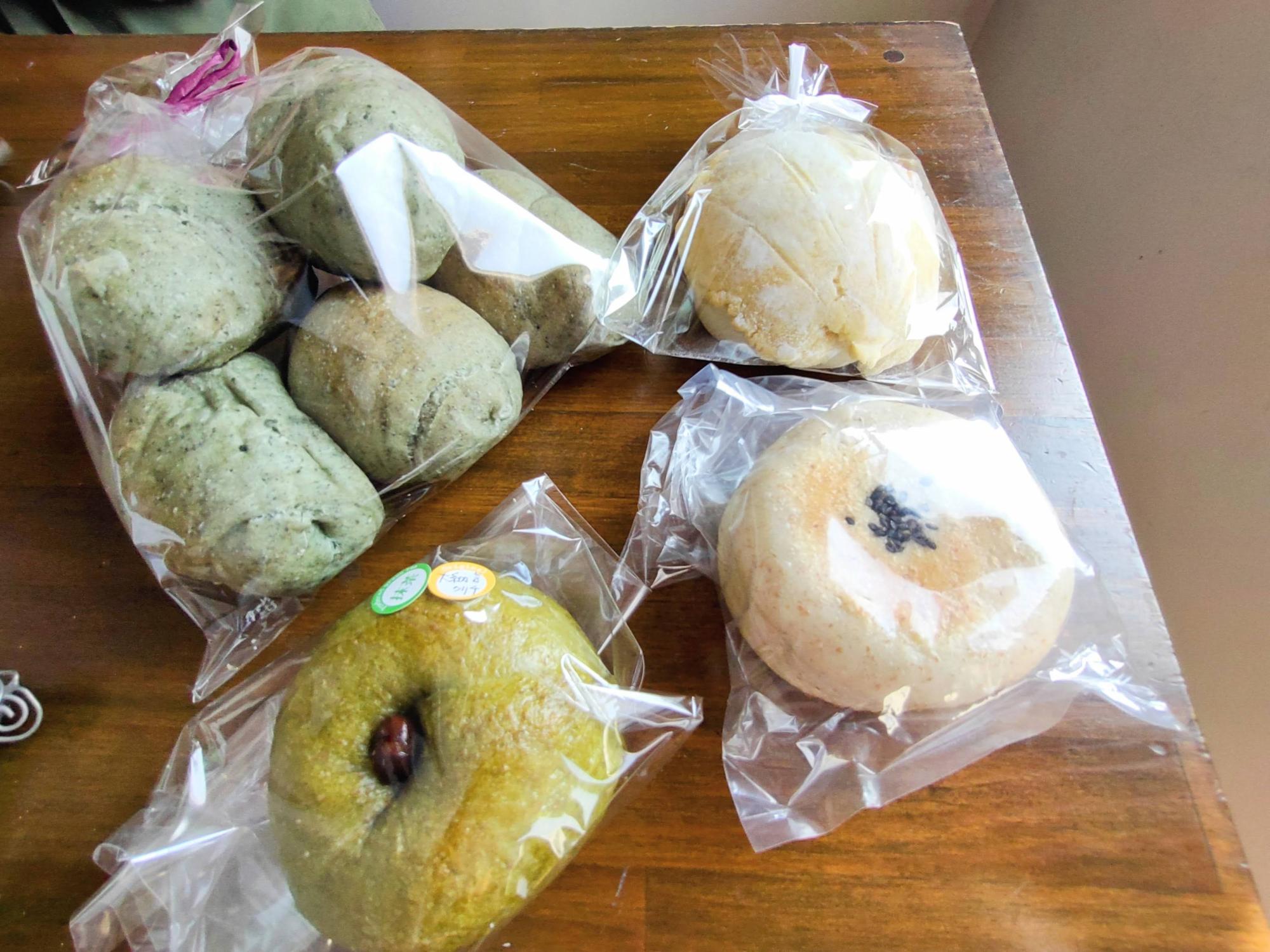 プレーン、黒糖、ごま、レーズン、よもぎ…と種類豊富なロールパン。