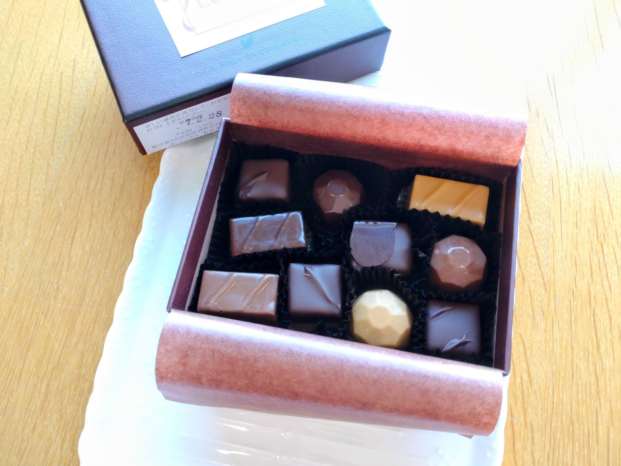 世界各国のカカオ豆を自家製のチョコレートにして、うきは市の果物やはちみつ、マロンや紅茶と組み合わせたル・シュクルさんでしか味わえないボンボンショコラです。