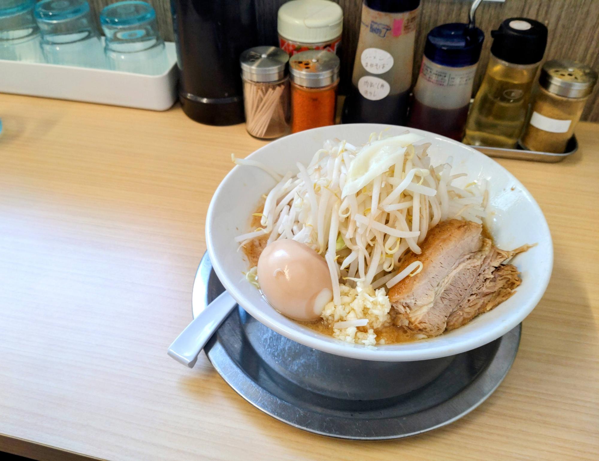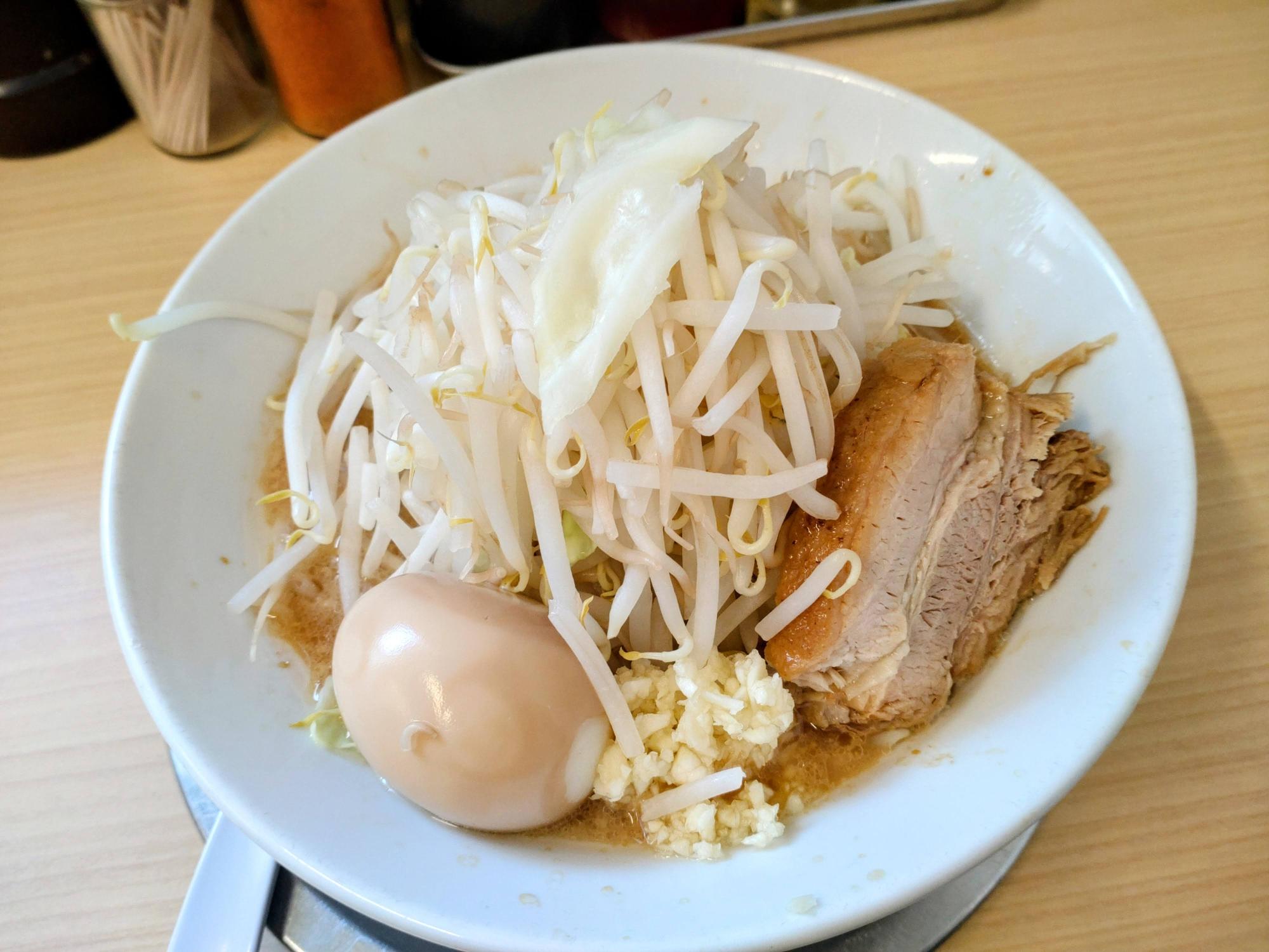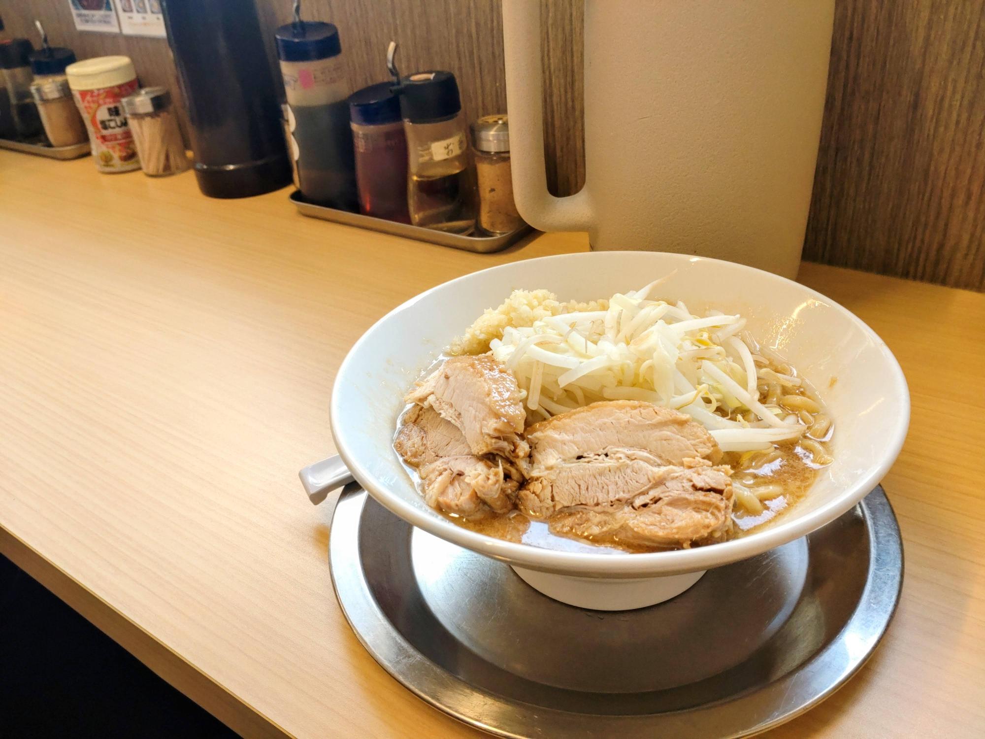 もやしと豚肉のボリュームに圧倒されつつ、豚骨ベース醤油味のスープをすすると…にんにくのパンチが効いておいしい!