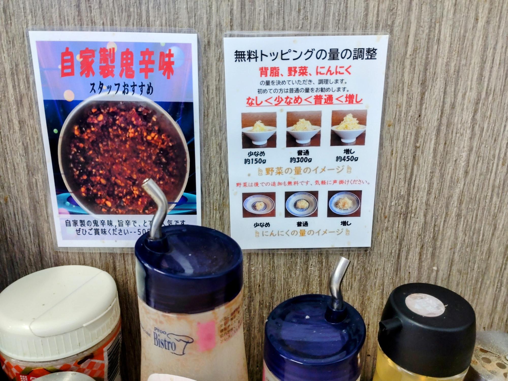 食券を購入し定員さんへ渡す時に、無料トッピングの量の調整ができるので、減らしたいものや増やしたいものを伝えてくださいね。