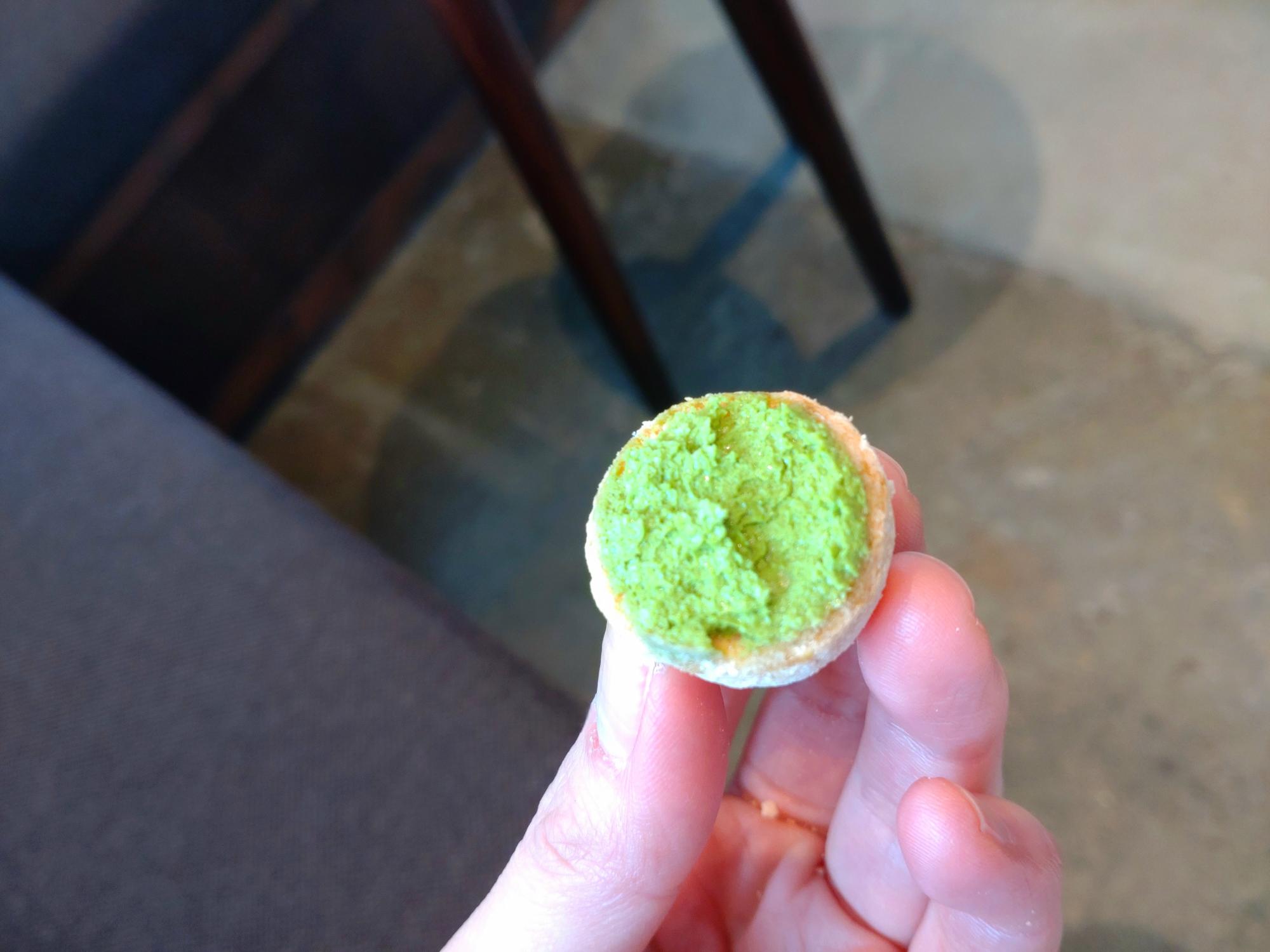 ダックワーズの中にはたっぷりのバタークリームが詰まっていて、抹茶のほろ苦さとバタークリームのまろやかさが合います。