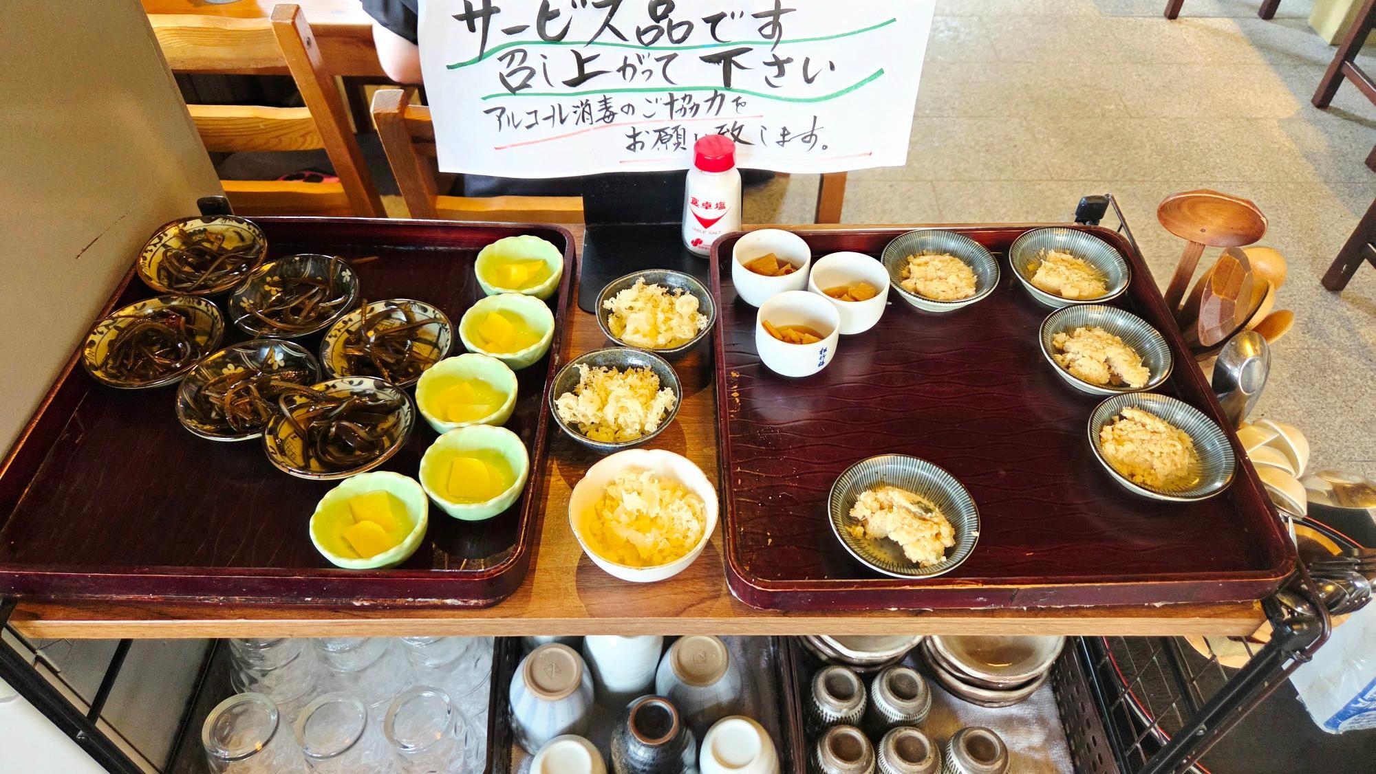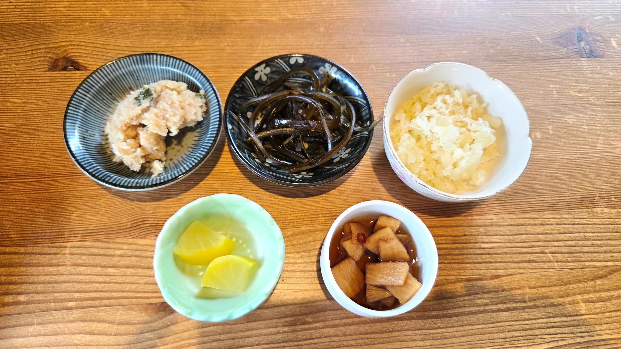 この日は、おからの惣菜・昆布の佃煮・天かす・お漬物2種類。