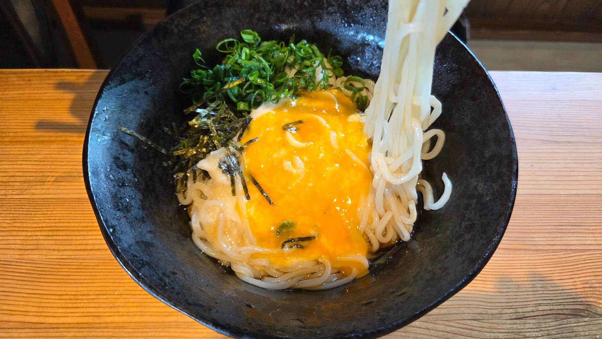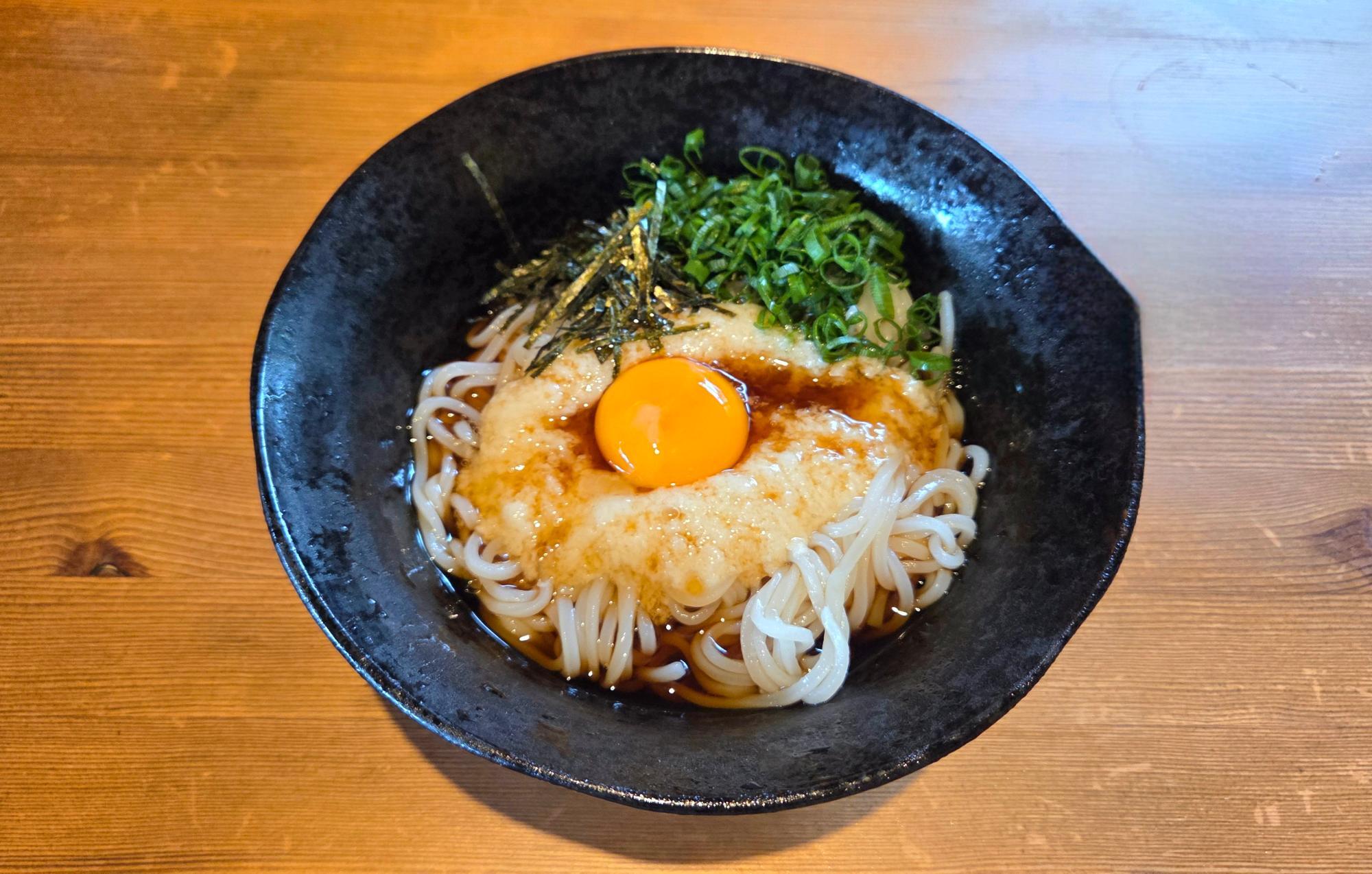 冷たくしめた細麺のうどんに、やまいも、卵黄、のり、ネギ。