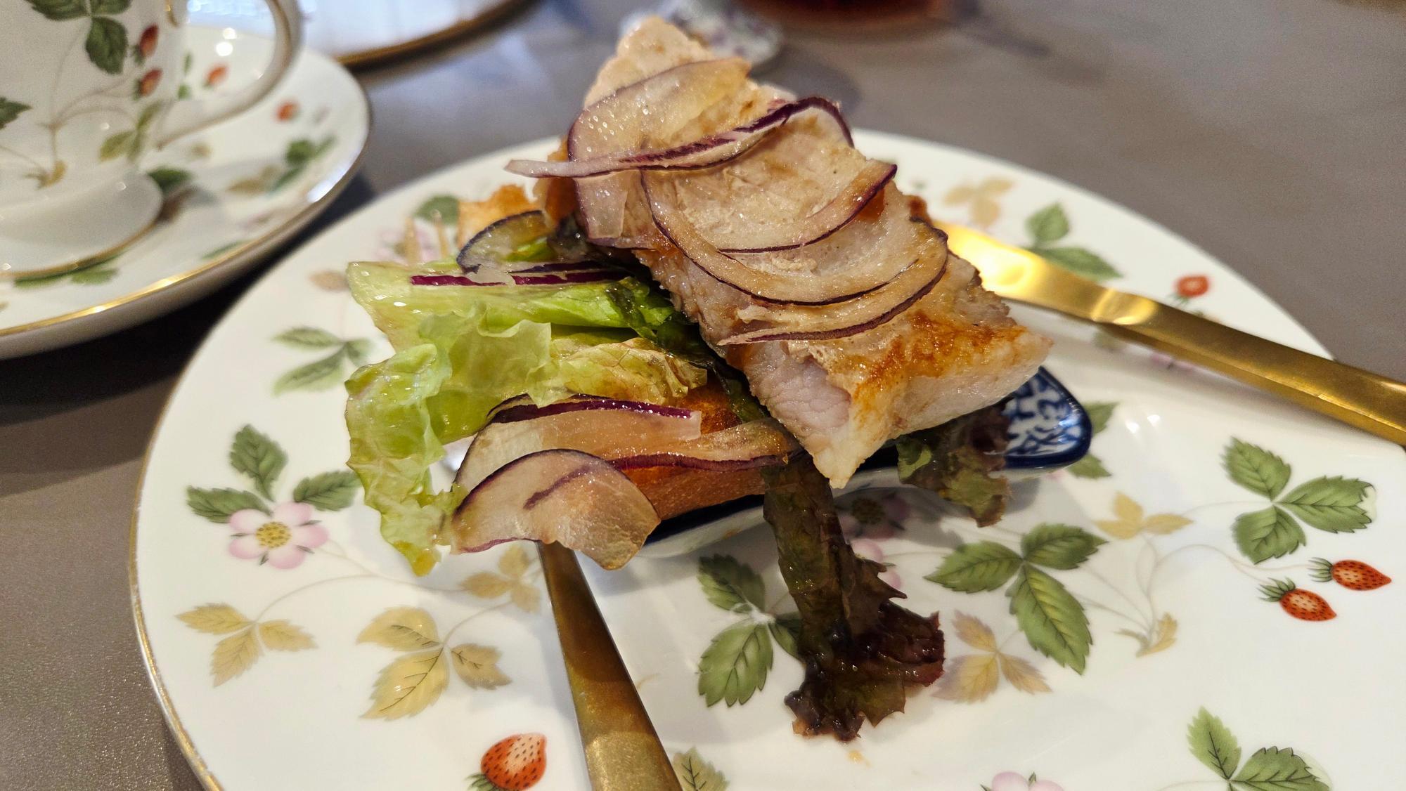 向かって右は、豚肉ロースのタパス。やわらかな食感と旨みのあるソースがしっかりと絡み、食べた瞬間「もっと食べたい…!」とやみつきになってしまう一品。