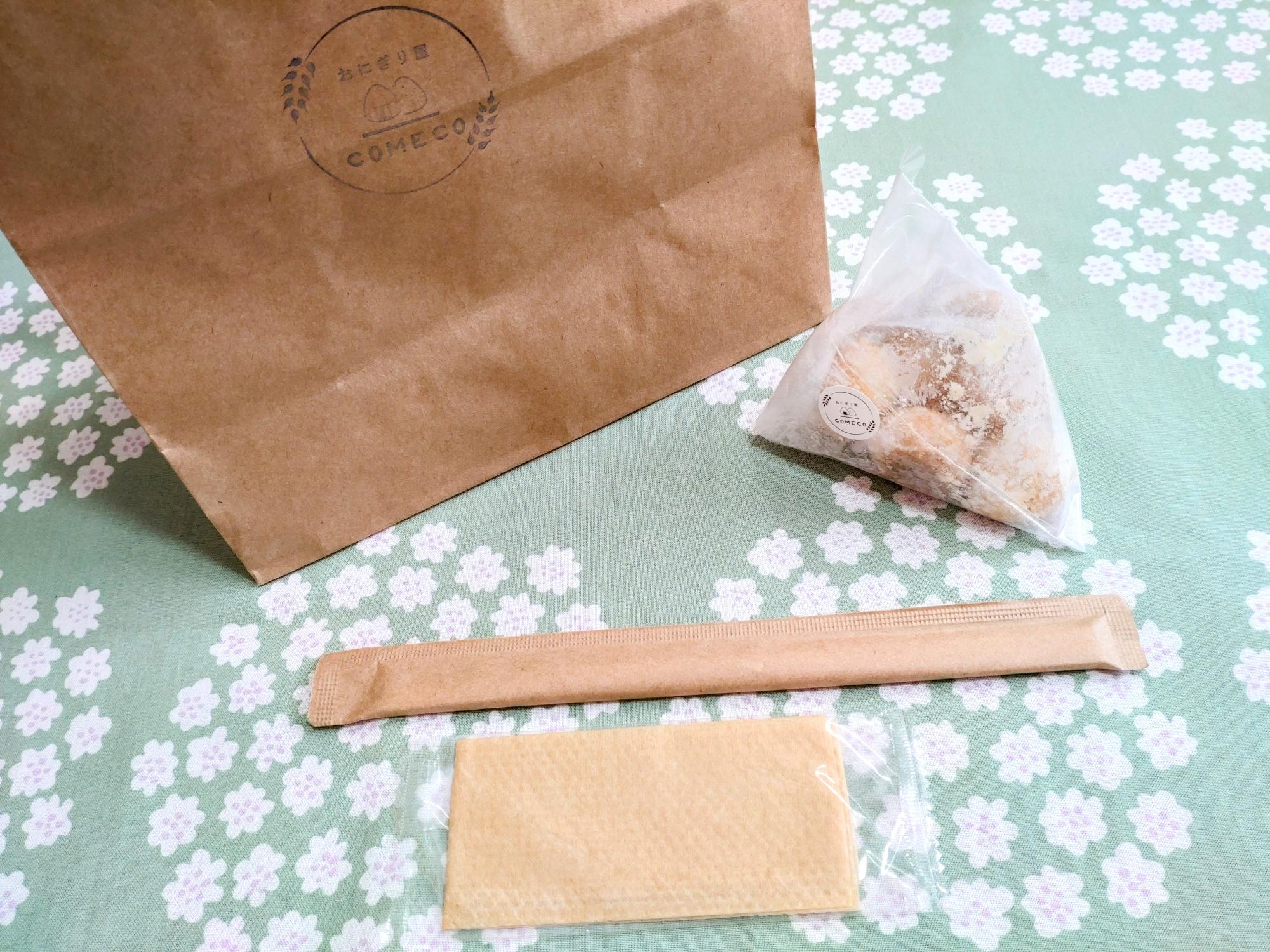 持ちやすい紙袋にお箸とおしぼりも付いているので、出先でも食べられるので嬉しいです。
