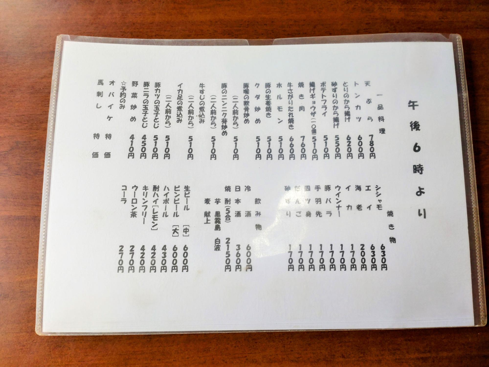 こちらは、午後6時からのメニューです。