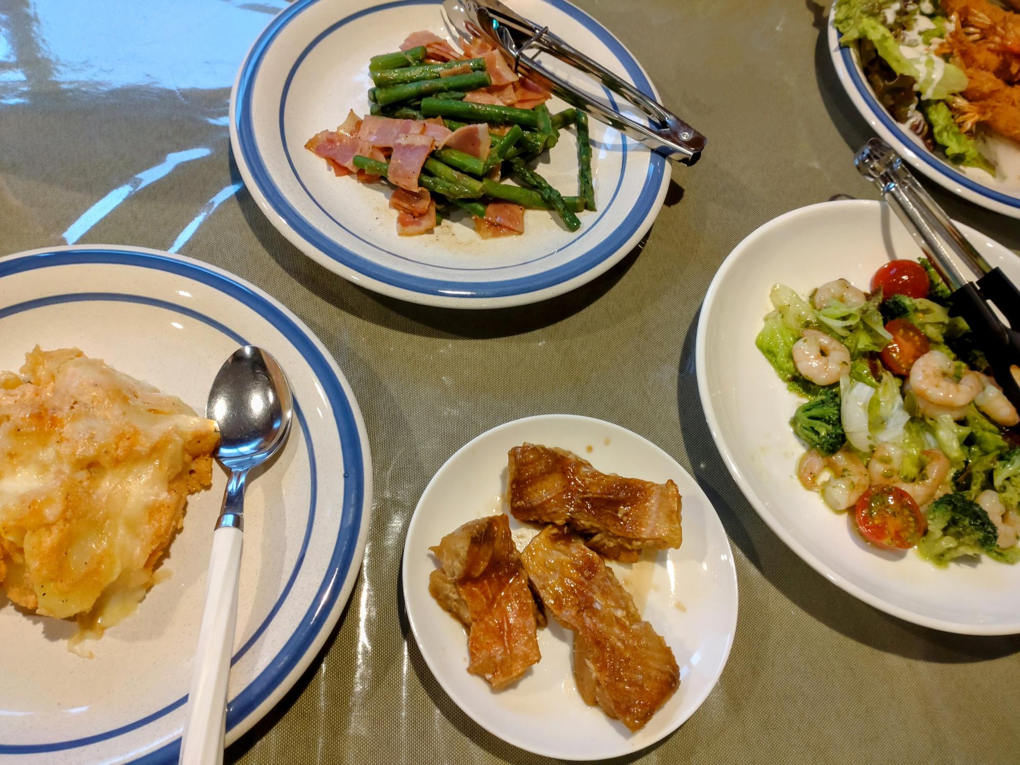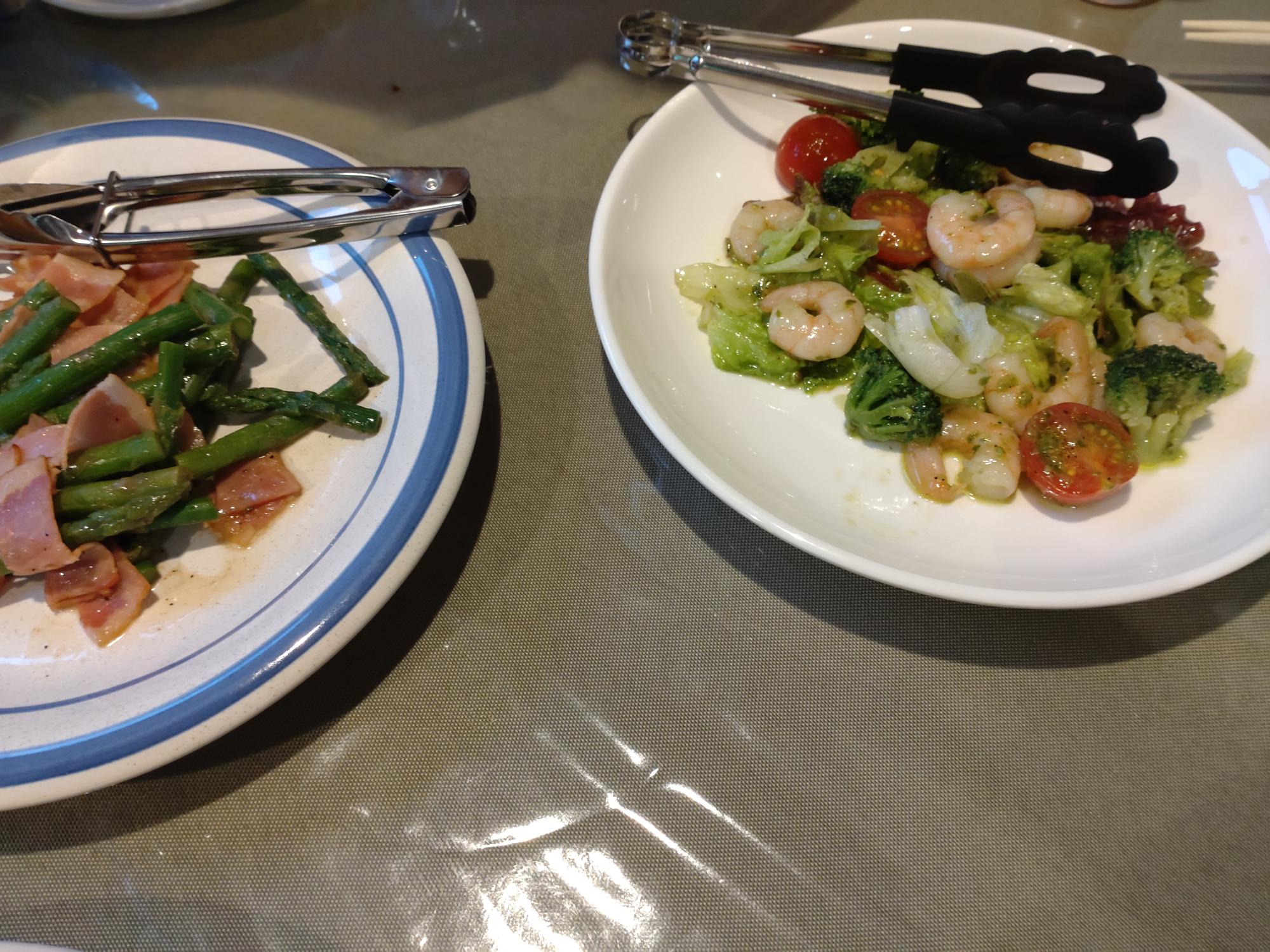 アスパラベーコンと、海老とブロッコリーのサラダ