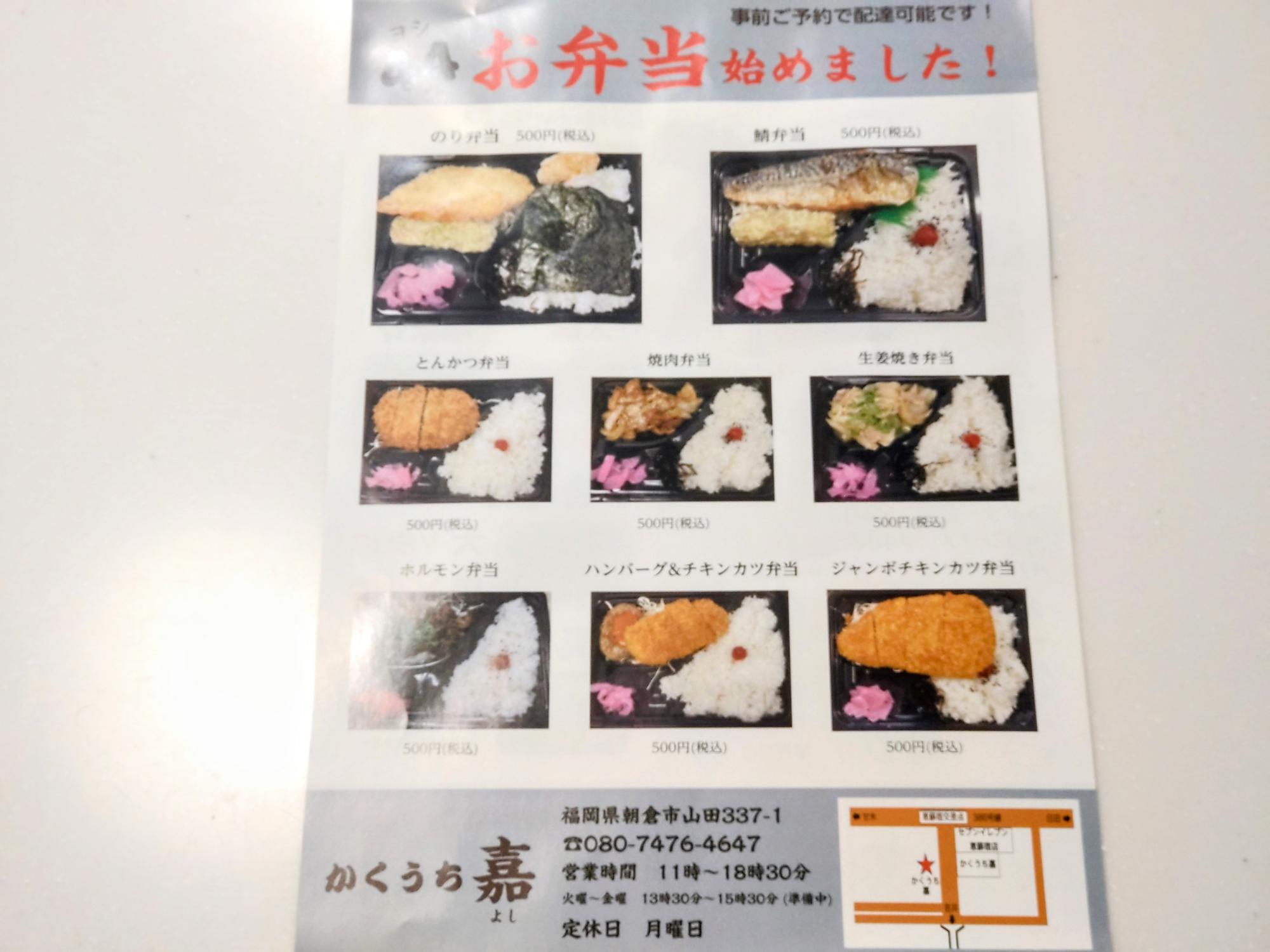 こちらの店舗は、道路を挟んで向かいにある食事もできる角打ちの店『KAKUUCHI 嘉(かくうち よし)』のオーナーさんが午前中から夕方まで経営されているお店で、近くにある「三連水車の里あさくら」や「道の駅原鶴 ファームステーションバサロ」にお弁当なども出されています。
