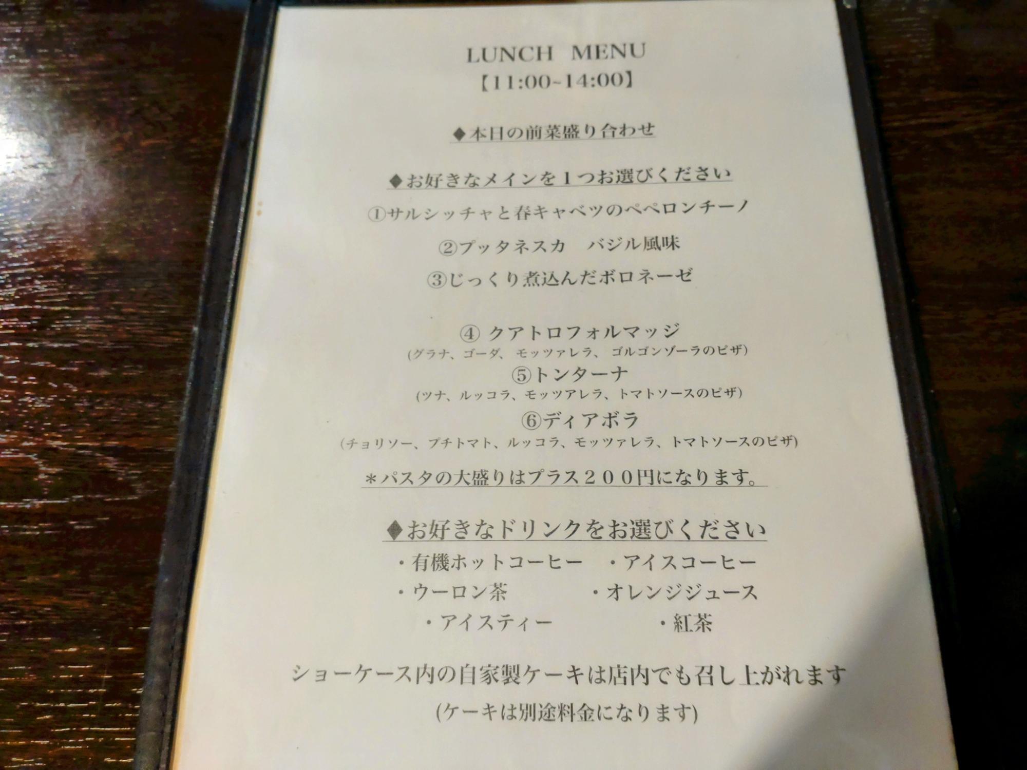 ランチメニューはメインにパスタかピザを選べ、前菜とドリンクが付いています。