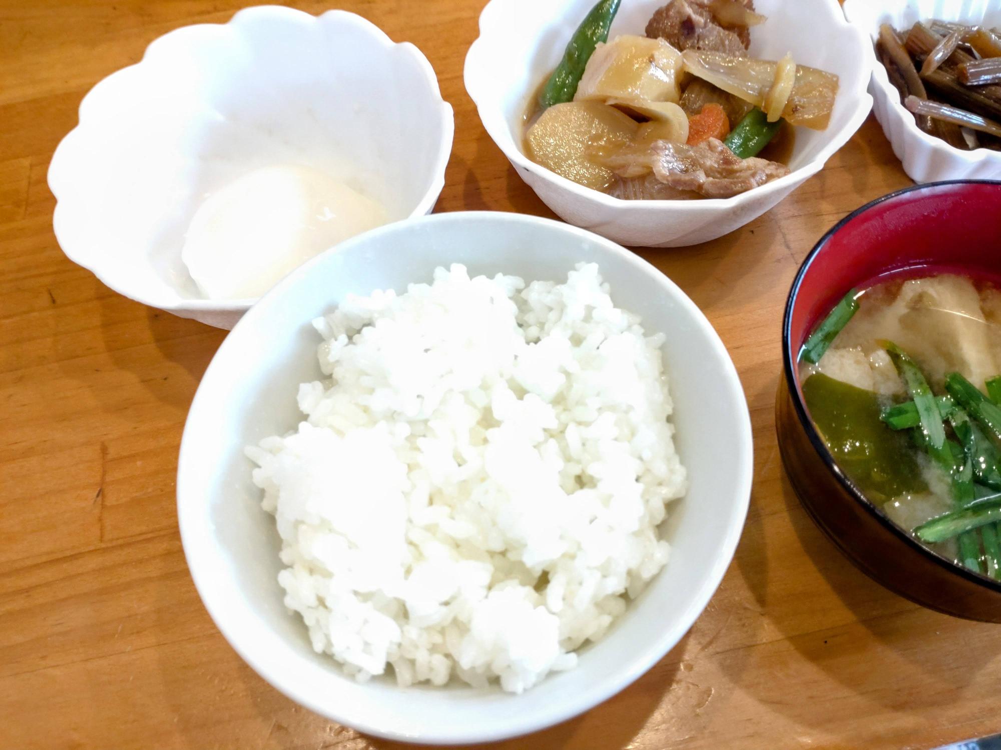味噌汁、小鉢、温泉卵までついて、ご飯のおかわりは無料という大サービス!